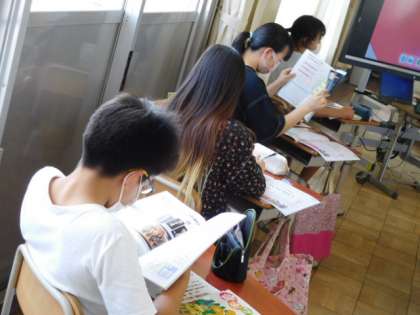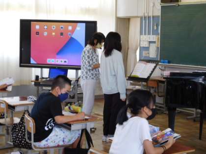 音楽です。「おぼろ月夜」の歌のテストを感染対策をしながら行っています。姿勢や語尾を丁寧に、強弱に気をつけて練習の成果を発揮しています。待っている間はこれまでの学習をまとめています。