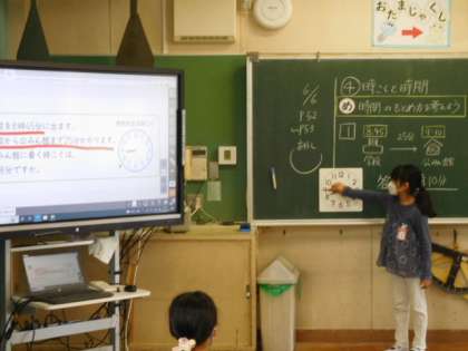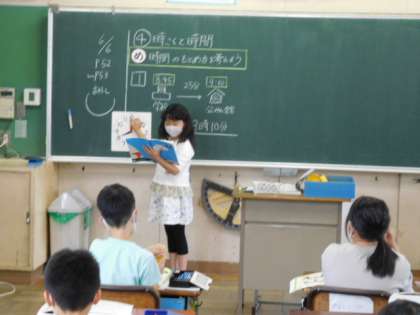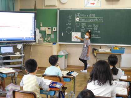 6/7(火) 3年生 公開日 2022/06/07 更新日 2022/06/07 3年生 算数です。「時こくと時間」の学習です。 「学校を8時45分に出ます。学校から公民館まで25分かかります。公民館に着く時刻は?」という問題をいろいろなとき方を発表し合って考えています。