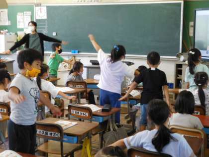 音楽です。今まで習った曲をメドレーで練習しています。リズムに合わせて振り付けをして踊っています。エネルギーあふれる歌声やダンスに元気をもらいました。