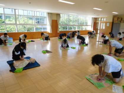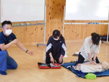 6/7(火) 心肺蘇生法研修会 公開日 2022/06/07 更新日 2022/06/07 全校 授業後、消防署の方を講師に招き、心肺蘇生法の研修会を教職員で行いました。プール指導の前に胸骨圧迫、AEDの使用方法などを確認し、子どもたちの大切な命を守るため危機意識を高めました。