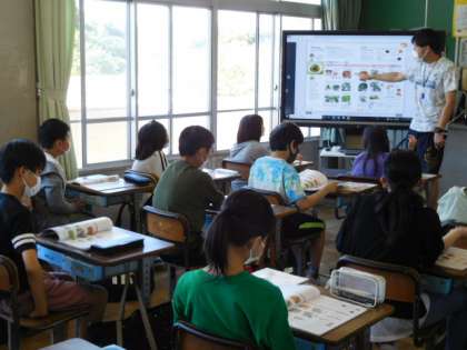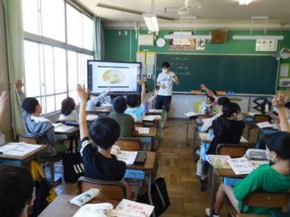 家庭科です。「おいしい楽しい調理の力」の学習です。「青菜のおひたし」や「ゆでいも」の調理方法を、動画を見ながら確認しています。調理の経験を出し合っていくなかで調理への興味が喚起されています。
