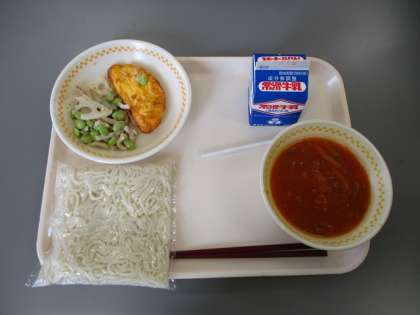 今日の献立は ソフトめん ぎゅうにゅう ミートソースかけ オムレツ れんこんとえだまめのサラダ です