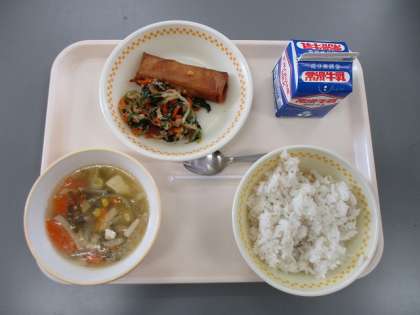 今日の献立は ごはん ぎゅうにゅう はるまき ビビンバ ちゅうかコーンスープ です