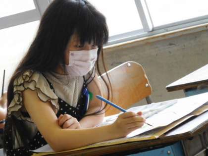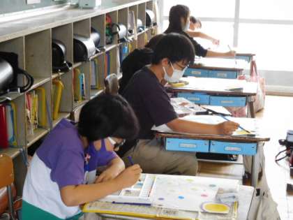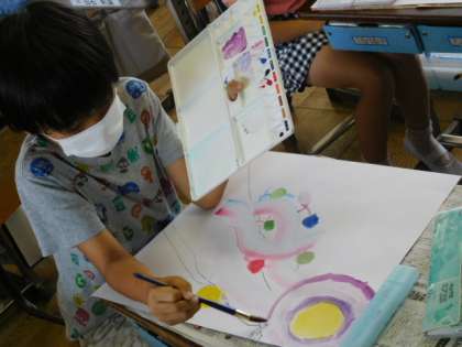 図工です。物語でイメージしたものを絵にします。絵の具でぴったりの色を作ったり、イメージした形を描いたりしながら仕上げていきます。絵の具の使い方の腕も上げています。
