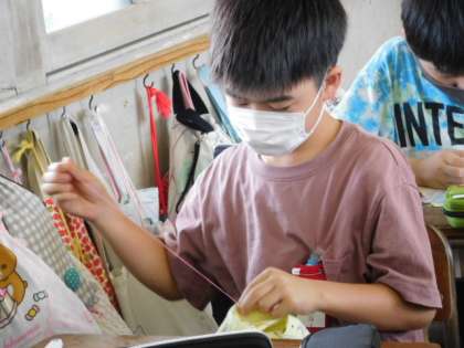 家庭科です。「ひと針に心をこめて」の学習です。本返しぬい、半返しぬいや玉留め玉結び等の基本の縫い方を学びましたので、その技術を生かし自分の名前を縫っています。