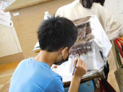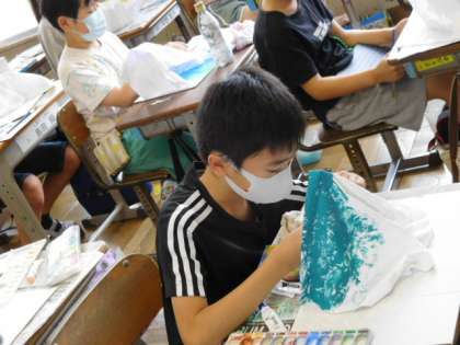 6/21(火) 6年生 公開日 2022/06/21 更新日 2022/06/21 6年生 図工です。「固まった形から」の製作です。液体粘土で固めた不織布へ着色が始まりました。色が塗られていくと、その形を見て何を想像したのかだんだん見えてきますね。