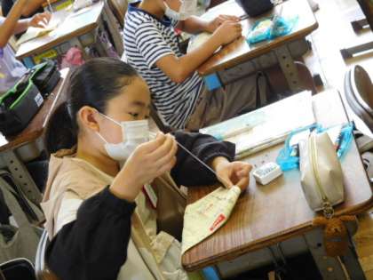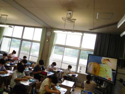 家庭科です。「ひと針に心をこめて」の学習です。基本の縫い方を練習しています。先生が見本を見せてくれています。電子黒板に大きく写されて手元がとても分かりやすいですね。