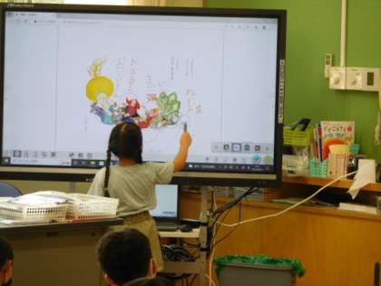 6/24(金) 1年生 公開日 2022/06/24 更新日 2022/06/24 1年生 国語です。「大きなかぶ」の学習です。お話を読んで、おもしろいところ、ふしぎなところなど感想を発表し合っています。電子黒板の挿絵を使って上手に説明しています。