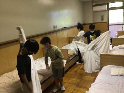 8:00からは清掃活動です。シーツを片付けたり、お世話になった部屋や施設の掃除に汗を流しています。