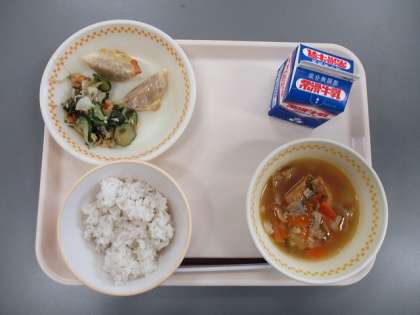 今日の献立は ごはん ぎゅうにゅう やきぎょうざ バンバンジーサラダ ピリからじる です