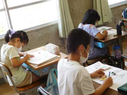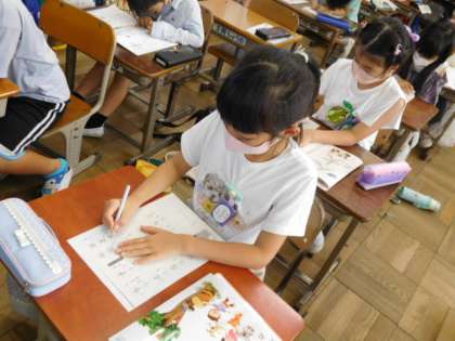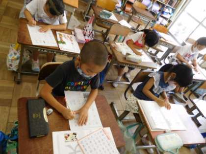 7/8(金) 2年生 公開日 2022/07/08 更新日 2022/07/08 2年生 書写です。めあては「角の方向に気をつけて書こう」です。「人」と「大」では、同じ左はらいでも各方向に違いがあります。それに気をつけて練習です。