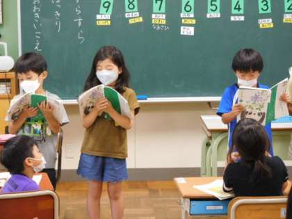 7/19(火) 1年生 公開日 2022/07/20 更新日 2022/07/20 1年生 国語です。「おむすびころりん」の学習です。好きな場面を選んで、音読の発表です。みんな1学期でとっても上手に音読ができるようになりましたね。