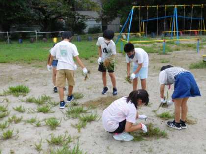 9/2(金) 草取り隊 公開日 2022/09/02 更新日 2022/09/02 全校 運動場に雑草がたくさん生え、目立つようになりました。各学級から隊員が集まり、草取り隊が発足しました。「自分たちが使う運動場を自分たちできれいに」を合い言葉に、2学期で雑草0を目指します。