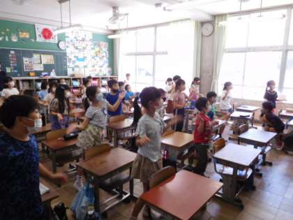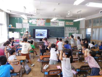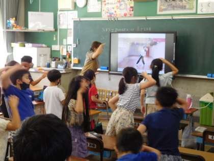 体育です。オカリンピックに向けて練習が始まりました。演技種目のダンスの練習です。まずはお手本の動画を見て、踊り方を覚えます。どんなダンスを披露してくれるか楽しみですね。