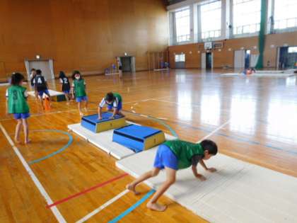 9/5(月) 3年生 公開日 2022/09/05 更新日 2022/09/05 3年生 体育です。「器械運動」の学習です。様々な器械運動の動きを鍛えるステージが用意され、ローテーションしながら練習しています。