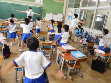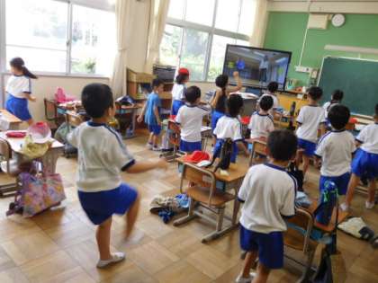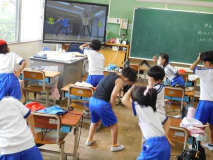 9/6(火) 1年生 公開日 2022/09/06 更新日 2022/09/06 1年生 体育です。オカリンピックの練習をしています。お手本の動画を見ながらダンスを踊っています。ものすごい吸収力でどんどん踊りを身につけていきます。