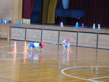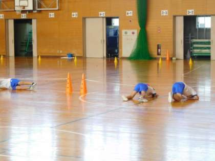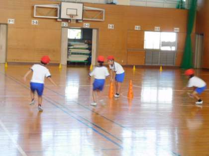 体育です。「障害物リレー遊び」の学習です。高さ30cmくらいに張られたゴム紐が障害物です。上手にスピードをいったん落として、素早くくぐり抜けなければなりません。思ったより手強い障害物です。