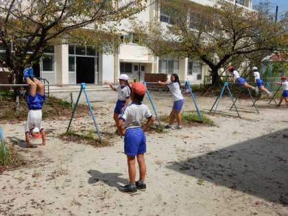 9/12(月) 4年生 公開日 2022/09/12 更新日 2022/09/12 4年生 体育です。「鉄棒運動」の練習です。3年生よりもできる技を増やしたり、たくさん回転できるように、みんな熱心に練習しています。
