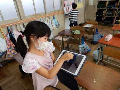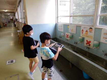 9/13(火) 2年生 公開日 2022/09/13 更新日 2022/09/13 2年生 図工です。「ともだち 見つけた!」の学習です。身の回りにかくれている「ともだち」をみつけようをめあてに、タブレットを使って、よく見ると顔に見えるところを探して撮影しています。「マグネットがが二つ並んでいるところが目に見えるよ」など、たくさんのお友達を見つけることができました。