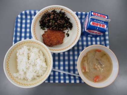 今日の献立は ごはん ぎゅうにゅう にくひじきごはんのぐ かれいソフトフライ ごじる です