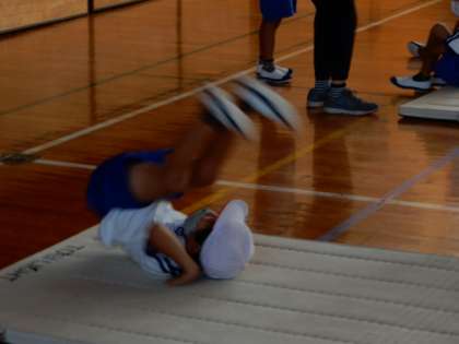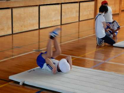 体育です。「器械運動(マット運動)」の練習です。1年合同授業で、1年生全員でマットの練習です。普段とは違う雰囲気でお互い刺激し合っています。