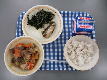 今日の献立は むぎごはん ぎゅうにゅう いわしのうめに にくじゃが こまつなのいそかあえ です
