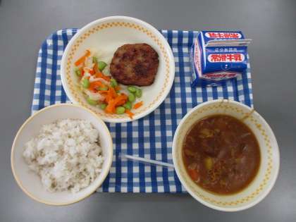 今日の献立は むぎごはん ぎゅうにゅう れんこんハンバーグ カレーライス えだまめとにんじんのサラダ です
