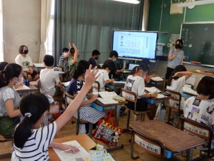 9/21(水) 6年生 公開日 2022/09/21 更新日 2022/09/21 6年生 国語です。「言葉の変化」の学習です。世代による言葉の違いを考えています。「帳面→ノート、えりまき→マフラー」など世代によって言葉遣いが変わるもの、たくさんありますね。