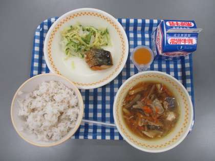 9/21(水) 給食 公開日 2022/09/21 更新日 2022/09/21 給食 今日の献立は むぎごはん ぎゅうにゅう さばのやさいあんかけ きゅうりとたくあんのごまあえ さわにわん ひとくちみかんゼリー です