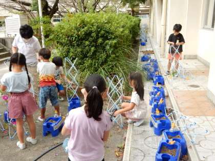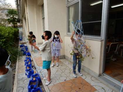 生活科です。朝顔の種を収穫した後、つるを植木鉢から取り除きます。このつるを使ってリースを作る予定です。