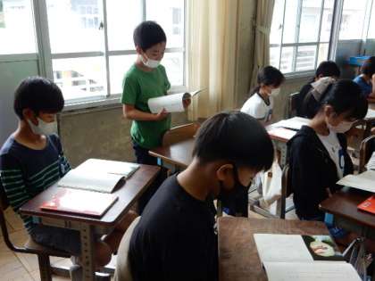 国語です。「ごんぎつね」の学習です。文章の中にある言葉からイメージを膨らませ、場面の様子を読み取っています。深い読み取りができる子がたくさんいます。