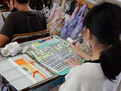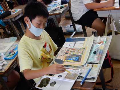 10/6(木) 5年生 公開日 2022/10/06 更新日 2022/10/06 5年生 図工です。学校の風景画の制作です。下描きが終わり、彩色に入りました。色を混ぜて、自分のイメージした色を出すのに苦心しています。