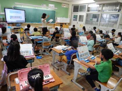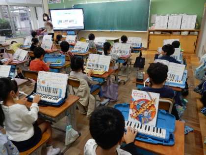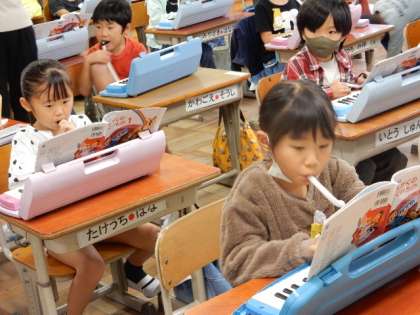音楽です。鍵盤ハーモニカの練習です。練習を積み重ねていくうちに、指が素早く動くようになってきました。吹き込む息の量も増えて大きな音も出せるようになってきています。