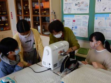 裁縫の学習です。今日はミシンの出番です。ミシンボランティアの保護者の方にお手伝いをいただき学習を進めています。たくさんの方に教えていただくと上達も早いですね。ミシンボランティアの皆さんありがとうございました。