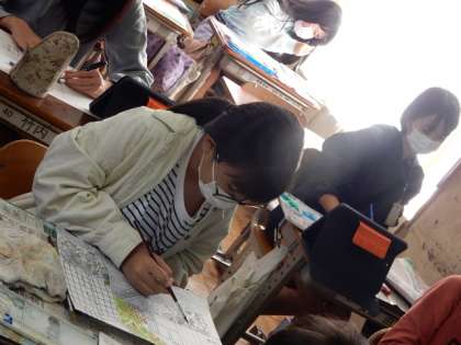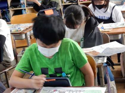 10/12(水) 6年生 公開日 2022/10/12 更新日 2022/10/12 6年生 図工です。岡田の街並書画写真展の作品の製作です。下描きが終わり、彩色に入りました。自分の出したい色を出すのに苦心しているようですが、着々と仕上がってきています。