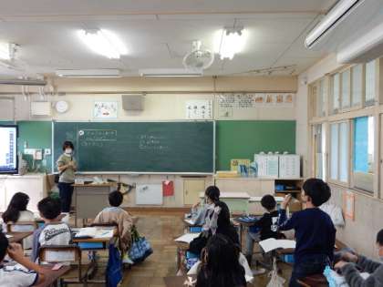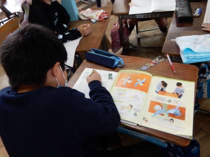 算数です。「円と球」の学習です。ふきこまを作って回しています。回っている形をよく観察すると…、ある形が見えてきますね。