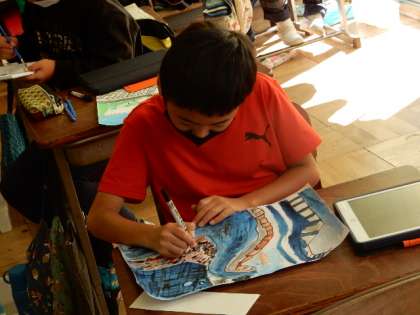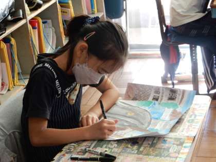 図工です。岡田の街並の絵を描いています。彩色に入り、思い通りの色を出すのに苦心していますが、少しずつ完成に近づいています。