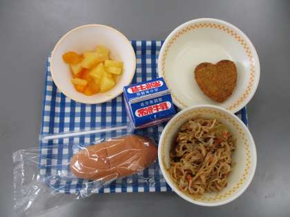 今日の献立は こがたロールパン ぎゅうにゅう やきそば パンプキンハートコロッケ フルーツポンチ です
