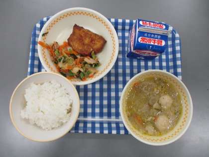 今日の献立は ごはん ぎゅうにゅう けんちんしのだのみそかけ やさいとツナのあえもの げんまいだんごのしる です