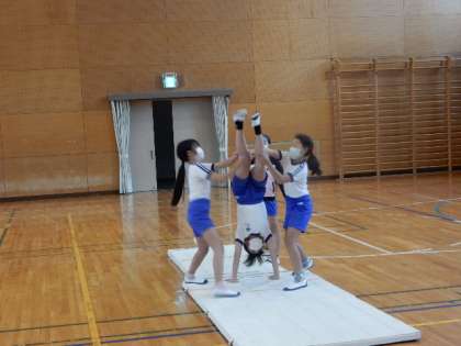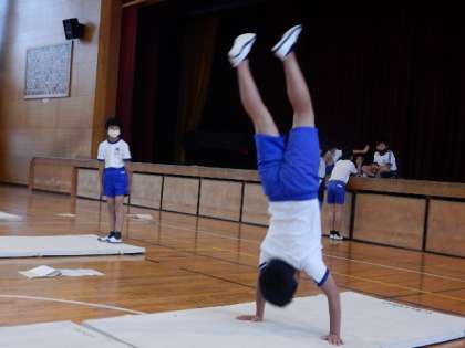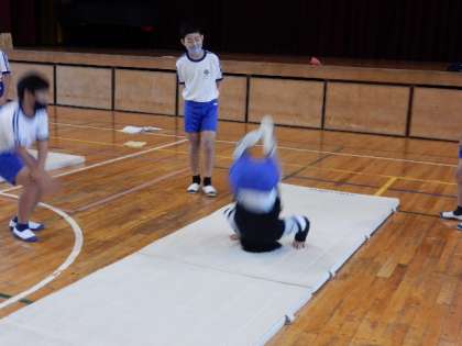 体育です。「器械運動(マット運動)」の学習です。開脚前転後転、倒立前転など身につけたい技を練習しています。友だち同士でアドバイスをし合って取り組んでいます。