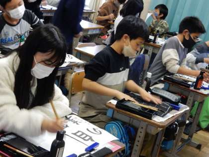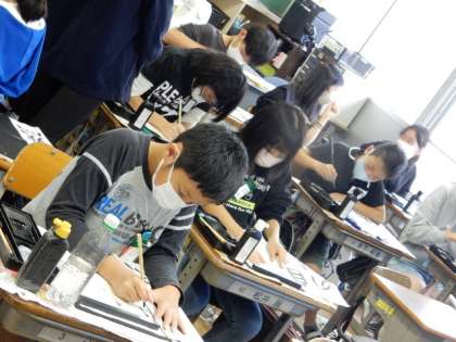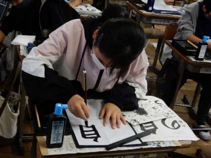11/1(火) 6年生 公開日 2022/11/01 更新日 2022/11/01 6年生 書写です。尾教研書写作品コンクール応募作品「自然の美」の練習です。よい作品を仕上げようと、すごい集中力で書き込んできます。