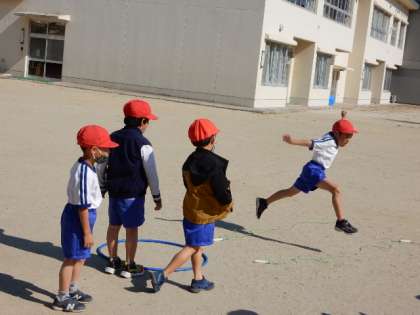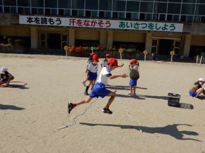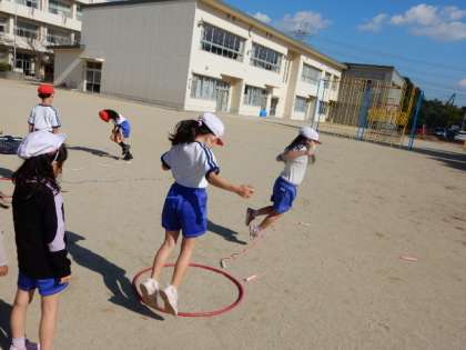11/8(火) 1年生 公開日 2022/11/08 更新日 2022/11/08 1年生 体育です。「走・跳の運動遊び(跳の運動遊び)」の学習です。2本間を空けて並べた縄跳びを左右交互に飛び越しています。跳躍力を鍛えます。
