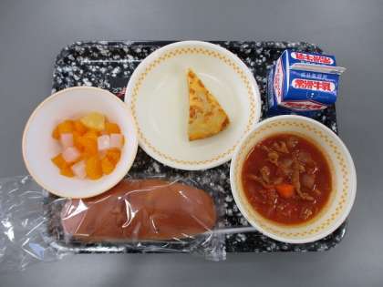 今日の献立は レーズンロールパン ぎゅうにゅう スペインふうオムレツ ポークビーンズ ナタデポンチ です