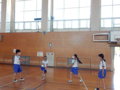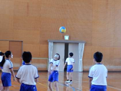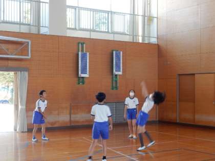 11/8(火) 5年生 公開日 2022/11/08 更新日 2022/11/08 5年生 体育です。「ボール運動(ネット型)」の学習です。バレーボールの練習をしています。まずは、グループでボールを落とさないようにパスでつなぐ練習です。