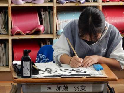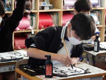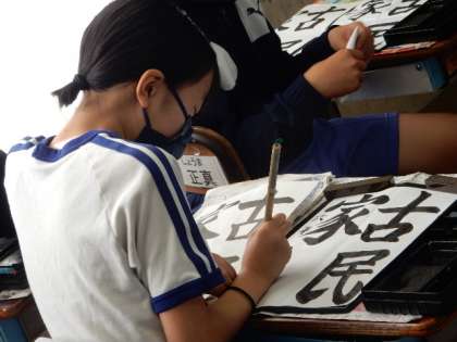 11/10(木) 6年生 公開日 2022/11/10 更新日 2022/11/10 6年生 書写です。赤だの景観書画写真展に出品する作品を書いています。6年生のお手本は「古民家」です。6年生は小学校最後の出品になるので、よい作品を書こうとがんばっています。