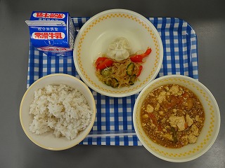 今日の献立は むぎごはん ぎゅうにゅう ショーロンポー マーボーどうふ はるさめのちゅうかあえ です