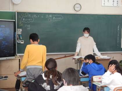 11/16(水) 6年生 公開日 2022/11/16 更新日 2022/11/16 6年生 理科です。「月の見え方と太陽」の学習です。夕方見える月と明け方見える月では、同じ三日月でも光って見える場所が違います。そのわけを考えながら月と太陽の関係を探っていきます。