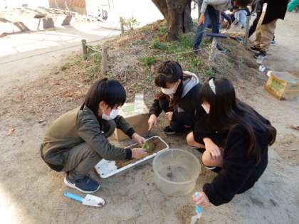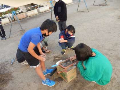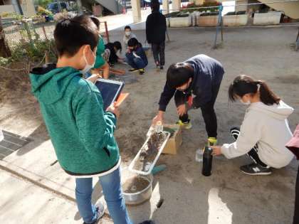 理科です。「流れる水と土地」の学習です。流れる水がどのように土地の形を変えていくかのシュミレーション実験です。今回は、石や木などを置いて、より実際に近い形で実験をしています。
