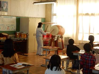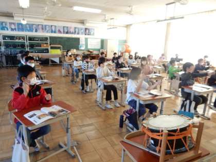 11/21(月) 4年生 公開日 2022/11/21 更新日 2022/11/21 4年生 音楽です。「おはやしのリズムを楽しもう」の学習です。たいこやかね、ふえなどお囃子で使われる楽器やどんなリズムで演奏するか学んでいます。