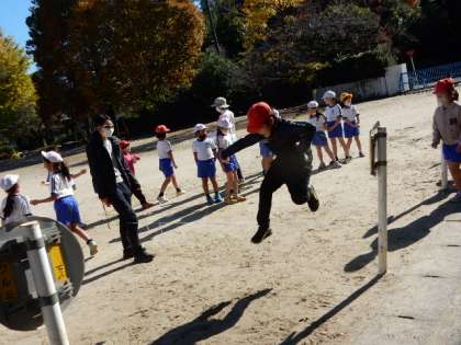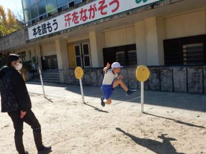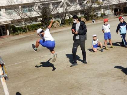 11/21(月) 2年生 公開日 2022/11/21 更新日 2022/11/21 2年生 体育です。「跳の運動(ゴム跳び遊び)」の学習です。ゴムを横にピンと張り、そこを跳び越える練習をしています。少しずつ高さを変え、より高く跳ぶことに挑戦します。